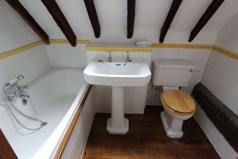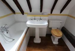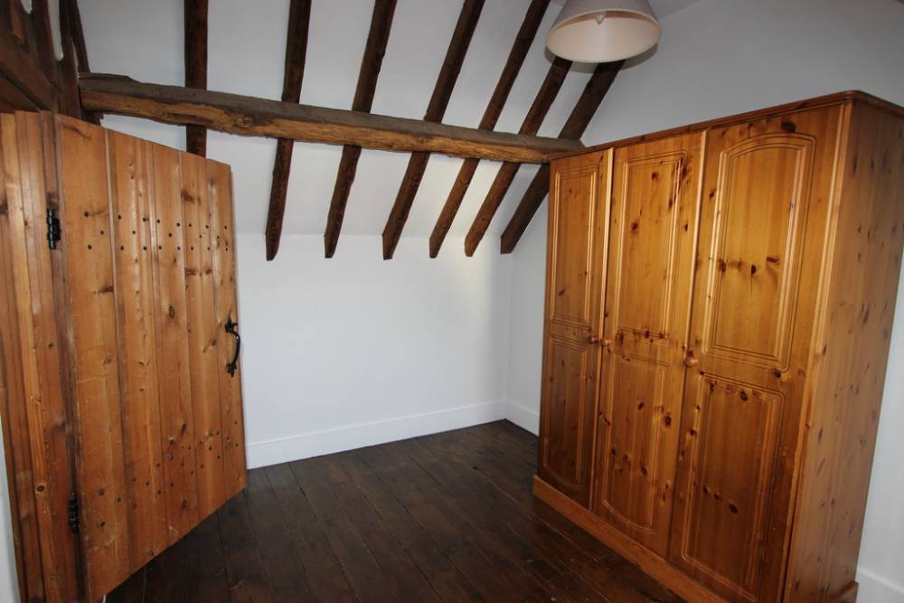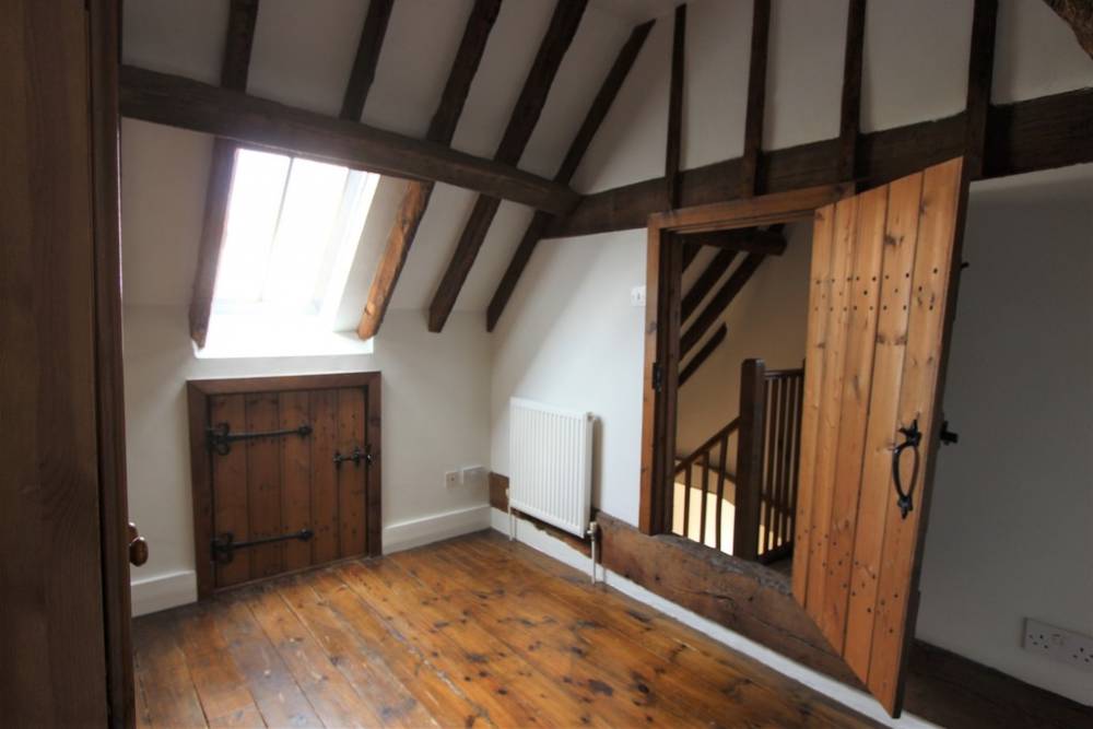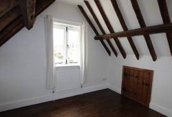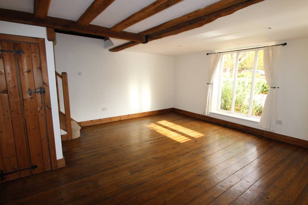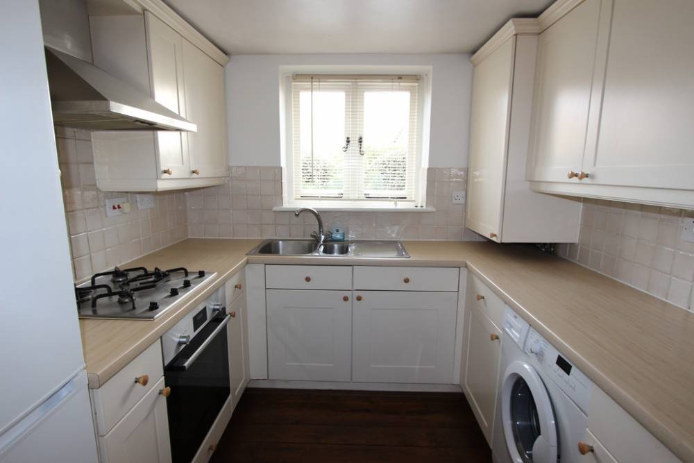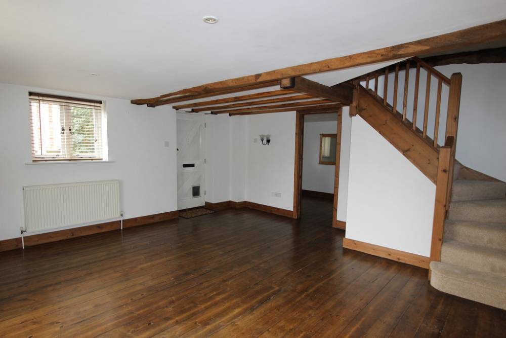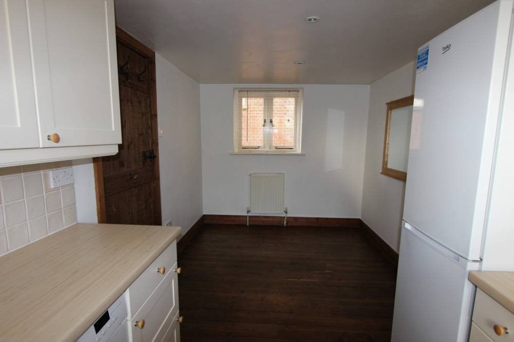 The accommodation comprises a spacious dual-aspect lounge providing plenty of natural light, alongside a combined dining area and shaker-style kitchen fitted with appliances. Upstairs there are two bedrooms, both benefiting from useful eaves storage, and a bathroom with a shower over the bath.